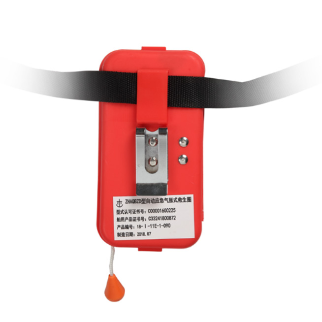 .Käytön aikana tarvitsee vain kiinnittää ulompi laatikko hihnaan. Ulompi laatikko voidaan kiinnittää kahdella tavalla, toinen on laittaa metallisolki suoraan vyöhön ja toinen on kiinnittää vyö vyön reiän läpi. Pelastusrengas on automaattinen puhallettava tyyppi, ja se voidaan myös täyttää manuaalisesti. Koska se on kosketuksissa veden kanssa, se voi automaattisesti täyttyä ja laajentua 5 sekunnissa muodostaen hevosenkengän muotoisen pelastusrenkaan, jolla on hengenpelastaja.